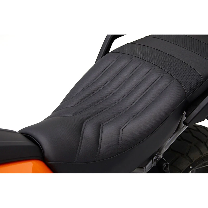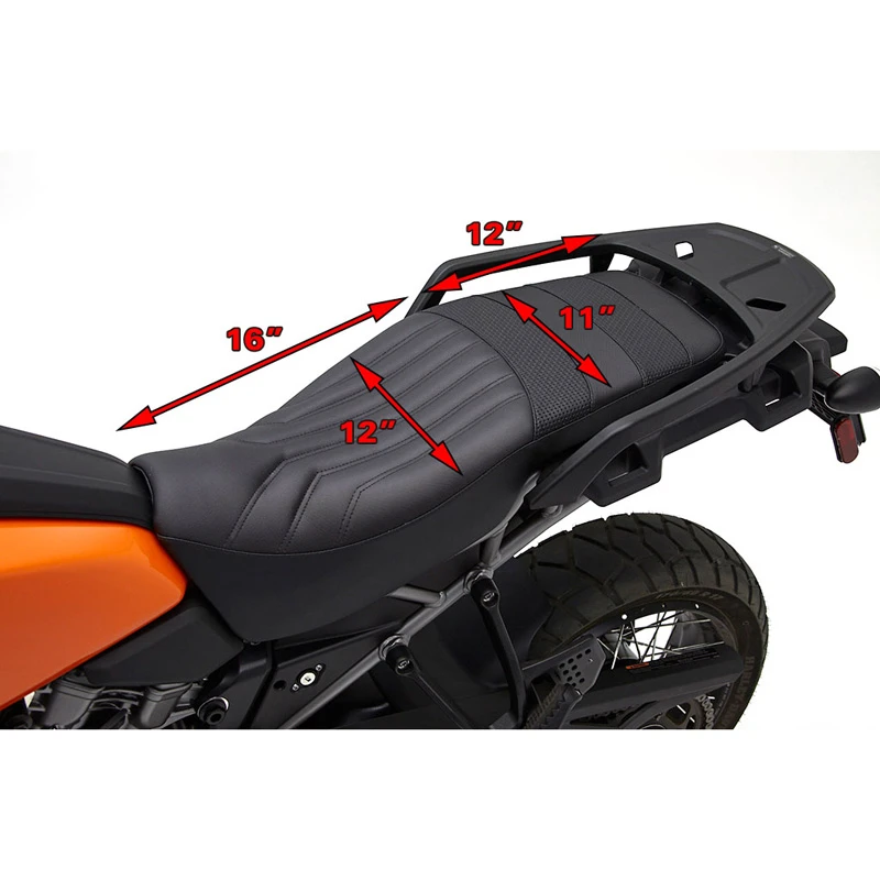 - Dual Sport saddle offers a slight bucket shape to eliminate hot spots yet is shaped to allow rider to move on the bike for off road riding.