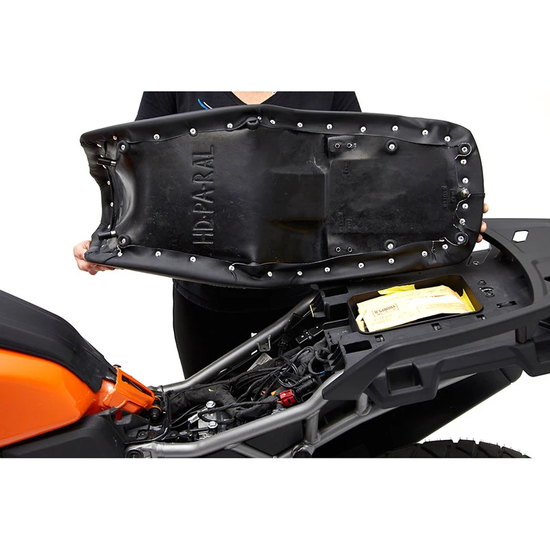 - Flatter design allows for rider body positioning fore and aft for spirited off-road riding.