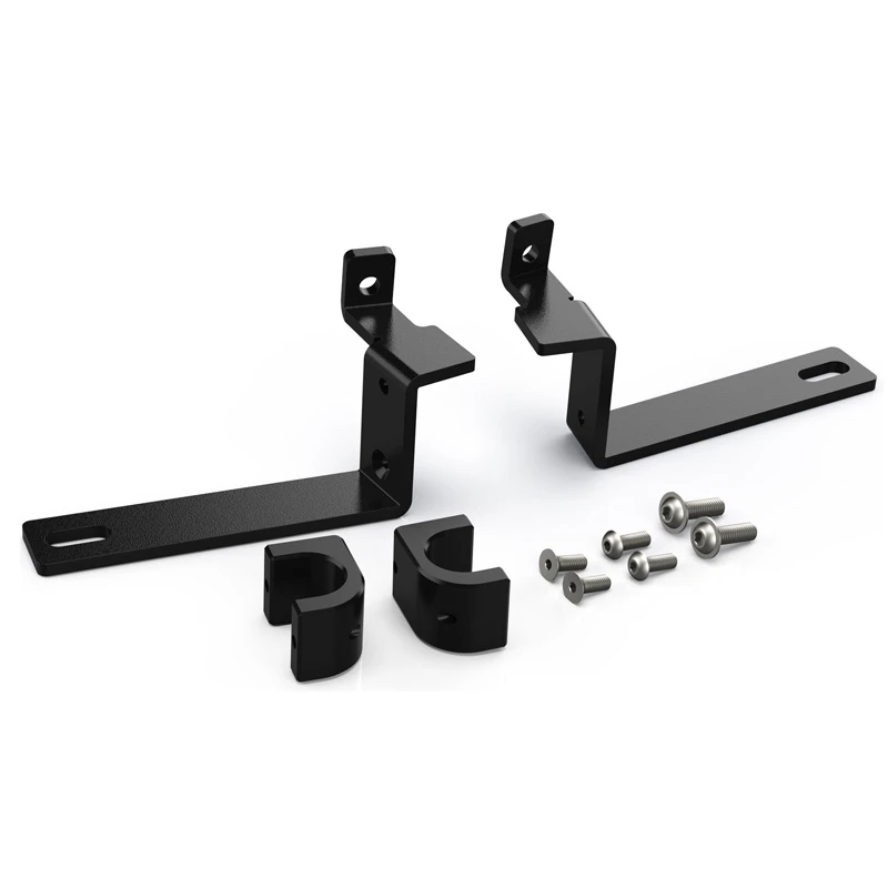 This vehicle specific driving light mount allows you to mount any DENALI driving light in the optimum location on your Pan America, right below and to the outside of your headlight. The design features a heavy-duty steel bracket and machined clamp assembly that securely mounts to the Pan America fairing support bar. The bracket has an M8 mounting hole for the light pods and includes all necessary mounting hardware.