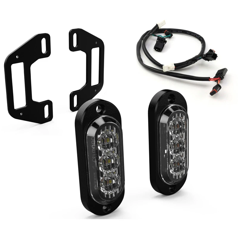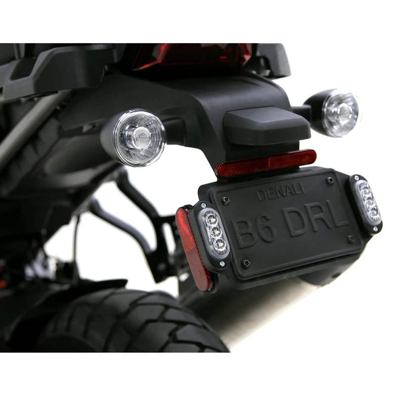 This pre-configured product bundle includes one set of DENALI Rear T3 Switchback Turn Signal Pods, a plug-&-play rear turn signal and brake light wiring adapter for the Pan America, and a license plate mounting bracket kit that positions the T3 pods in the ideal location on the back of your Pan Am.