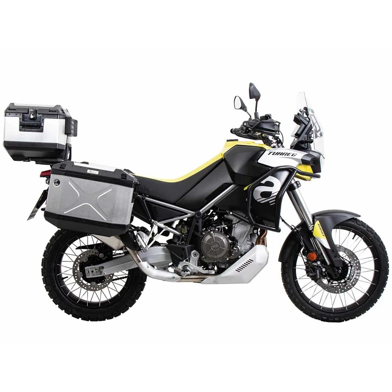 Hepco & Becker’s 651.7599 00 Xplorer Cutout Side Carrier Kit, Silver is made specifically for Aprilia Tuareg 660 (2022-current).