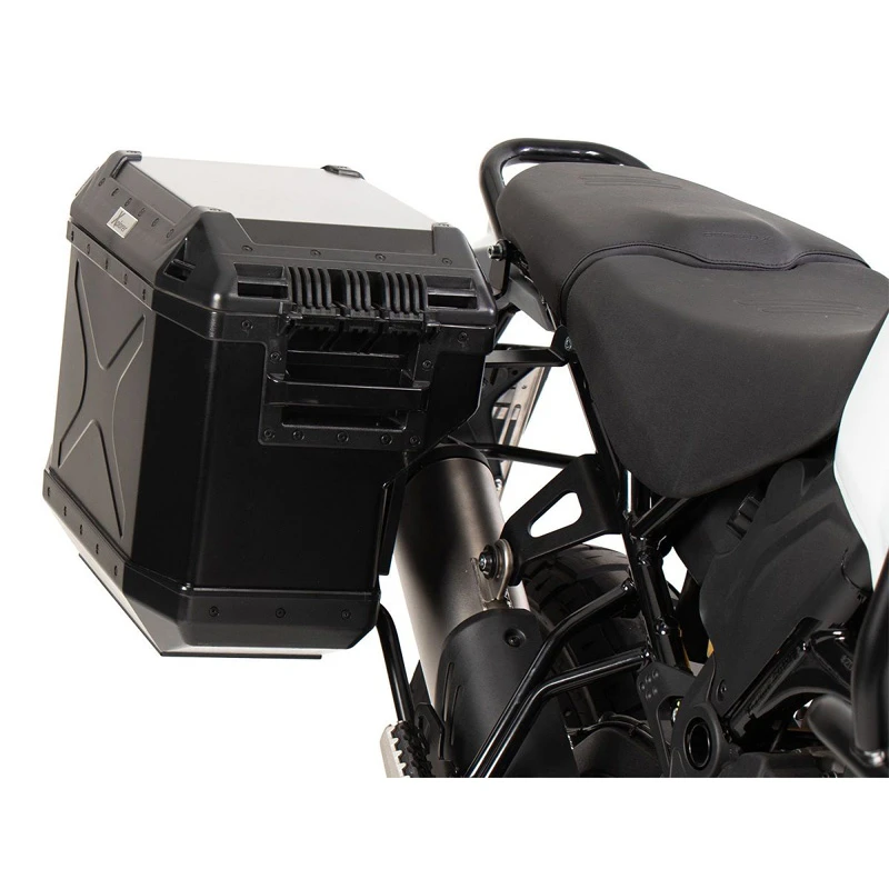 The Hepco & Becker cutout side carrier provides all the benefits of the standard side carrier while saving valuable space. The cutout is different from the normal side carrier where it is built around the exhaust providing a minimal width as possible. This is a kit that includes the cutout side carrier, 40 liter xplorer for the non exhaust side, and 37 liter xplorer for the exhaust side. They mount in the traditional way with lock and key and maintain the quick on and off use. The cutout cases come in either black or silver and are specifically designed for each bike. It provides the perfect loadout for adventure riding and off-roading!