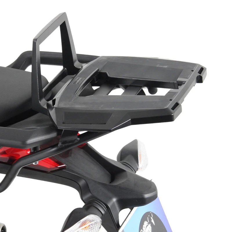 The Rear Alurack is a fixed rack bolted on to the rear of your bike allowing you to attach any top case offered by Hepco & Becker and more. Every Alurack is custom fitted to each individual bike. Racks are attached to the motorcycle through strong points on the frame of the motorcycle. These racks are made of high quality cast aluminum with an integrated plastic cover. The top bow for the rack can be taken off for carrying luggage besides top cases. Features strap holes all around utilized to strap luggage down. All racks are relatively easy to install and come with the required hardware and instructions needed.