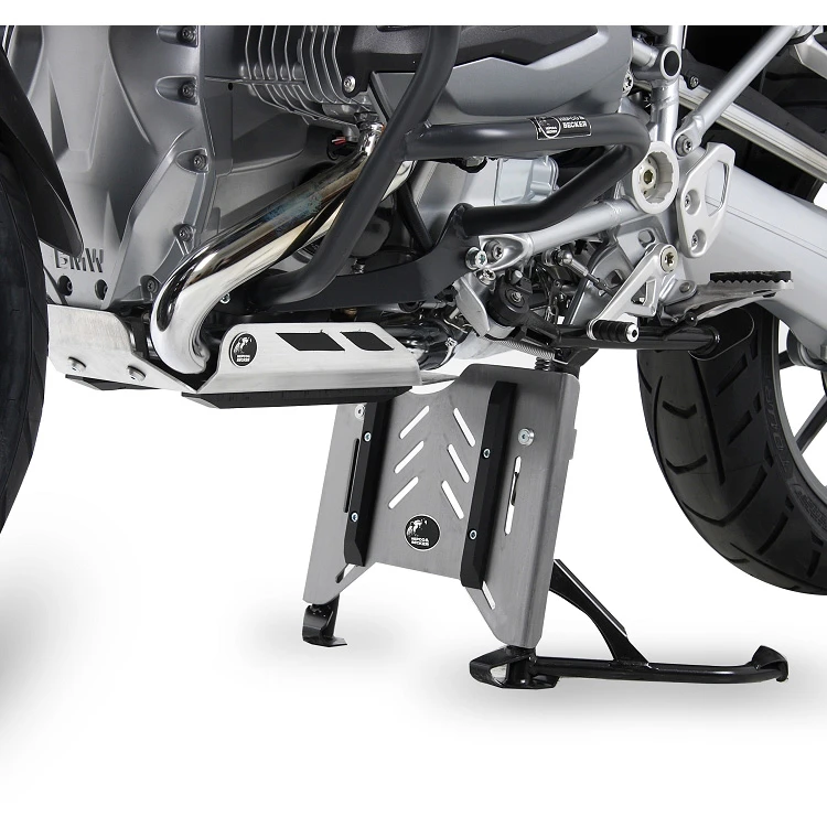 Hepco & Becker’s 810.665 00 09 Engine skid plate is made specifically for BMW R1200GS from 2013. This plate is designed to protect the underside of your motorcycle without compromising the design or functionality. All skid plates have their own carefully designed mounts that will ensure shocks are absorbed by the skid plate first. Made from 5mm thick aircraft grade aluminum. Has 3 mounting brackets and points. If the skid plate is hit hard, the stress will immediately transfer to the brackets versus the engine.