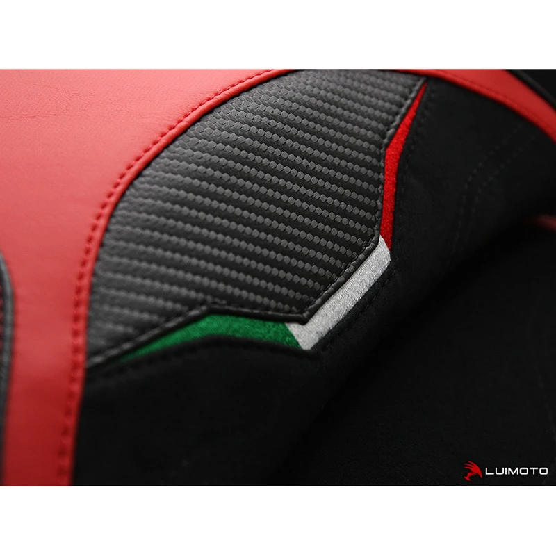 The Ducati Multistrada Team Italia seat cover is hand made with all our finest materials. Featuring suede, tec-grip, and leather look panels with a red border to add a bold Ducati-esque statement. Finally an italian flag embroidery and carbon fiber textured vinyls stitched in red complete the design. This is the ultimate expression from Luimoto to your Multistrada.