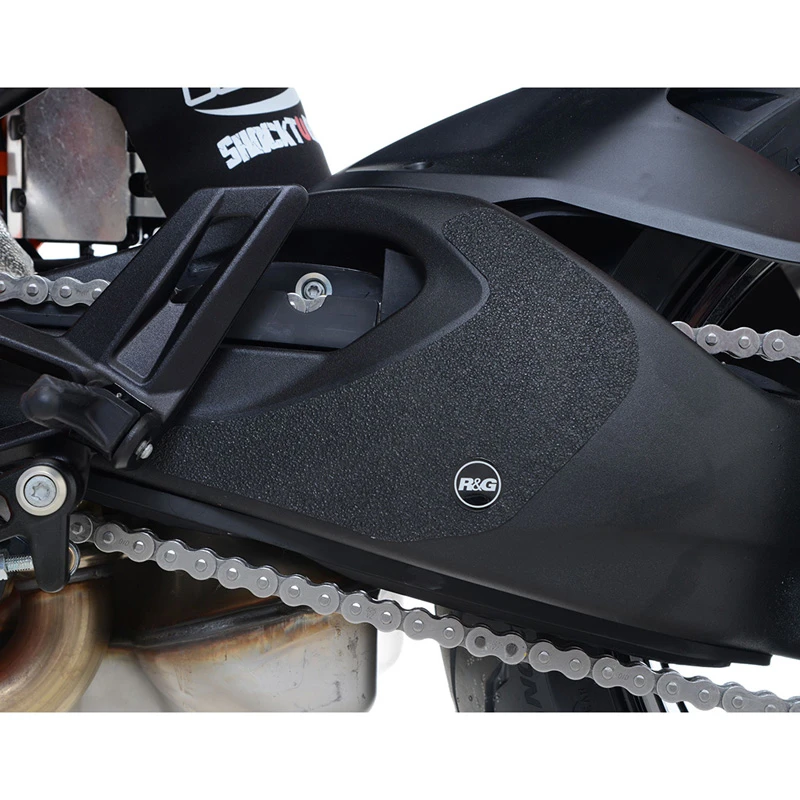 This R&G boot guard kit protects your expensive riding boots as well as the finish on your swingarm. With a soft, yet durable, leather friendly texture, this grip provides positive contact and feedback while extending the life of your footwear and paint. Precision pre-cut to match the lines of your motorcycle, high strength self-adhesive backing allows for easy installation as well as long life.