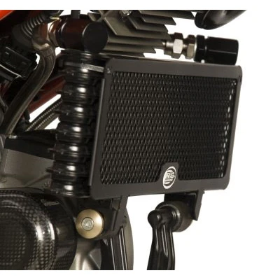 - R&G Oil Cooler Guards are constructed from pressed aluminum with a black finish.