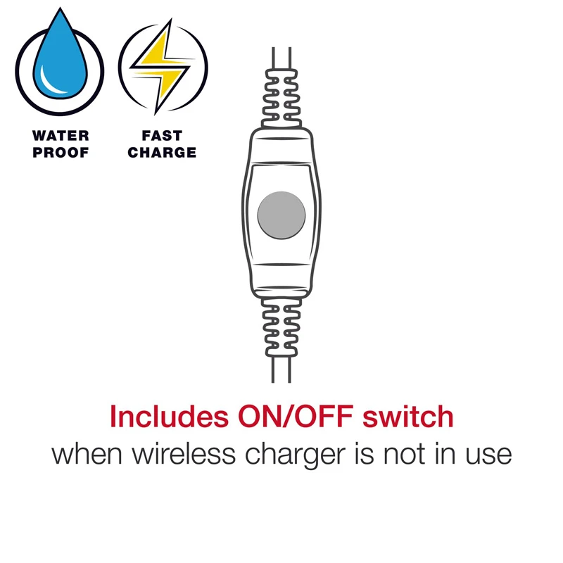 The RAM Tough-Charge with X-Grip Technology is the world’s first patented, universal waterproof wireless charging cradle for phones. Designed with spring-loaded RAM X-Grip Technology, this cradle features an ‘X’ design that expands and contracts to secure nearly any phone while taking advantage of Qi wireless phone charging. All four arms feature rubber-coated caps that hold your phone firmly in place, and the open design keeps buttons and switches accessible on the sides of phones. To insert your device, simply squeeze the arms on one side of the cradle and place your phone inside before releasing the arms. This Qi compatible wireless charging cradle ensures your compatible phone charges no matter what position it’s placed at. For added security and peace of mind, a device tether is included that’s recommended for outdoor applications. In addition, a support leg can be adjusted to the ideal position or removed altogether. This RAM Tough-Charge with X-Grip Technology wireless charging handlebar kit includes a B size diamond base featuring a 1″ rubber ball, short length double socket arm, and zinc-coated U-bolt base. U-bolt hardware accommodates rails from .5″ to 1.25″ in diameter. The connected Type-A male pigtail connector features an in-line switch that allows you to turn off the wireless charging module when not in use. For in-vehicle charging, attach the pigtail to the included 1.2m Type-A male to Type-A female extension cable. This kit includes a hardwire charger.