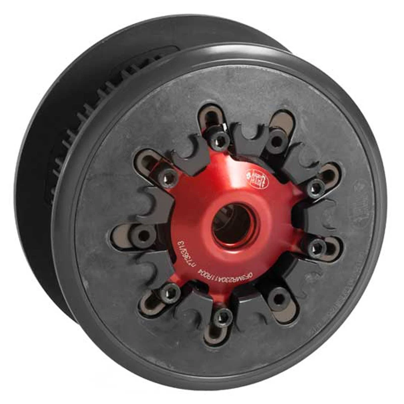 All components come from STM Slipper Clutch, is made with the most sophisticated machines. For the production STM Slipper Clutches selects the best aeronautic alloys and the best suppliers for surface treatments. Drum and hub are realized in Ergal 7075 and oxidized to last long. Also the pusher plate is in 7075, but it has a steel ring which gives a stiff support to the Diaphragm Evoluzione spring. This spring is the real heart: it is possible to chose between different kind of hardness and adapt the clutch to pilot’s needs. Pusher plate kit, with the function of checking plates opening is completed by a brassbearing rest holder and a pusher spring hub in steel and nitride coating. This treatment helps steel components to last longer, increasing surface hardness. STM Slipper Clutches kit assembly uses original Friction Plates, Drive Plates and basket.