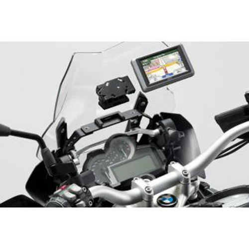Sw-Motech’s electronic mount is outfitted with quick-disconnect and vibration damped mechanisms. It will hold any RAM-B-238-compatible RAM Mount, Garmin Zumo GPS, TomTom Rider GPS, or a Bags-Connection GPS or PDA pocket. Two additional RAM balls (RAM-B-309-3U) can be added to the GPS mount bar for even more mounting possibilities!